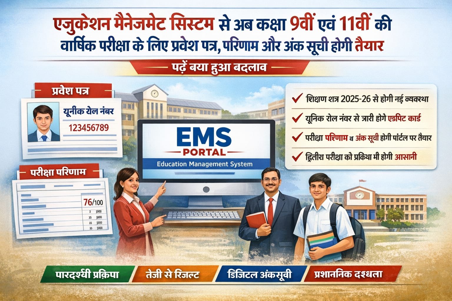एजुकेशन मैनेजमेंट सिस्टम से अब कक्षा 9वीं एवं 11वीं के विद्यार्थियों की वार्षिक परीक्षा के लिए प्रवेश पत्र, परिणाम और अंक सूची होगी तैयार, पढ़े क्या हुआ बदलाव