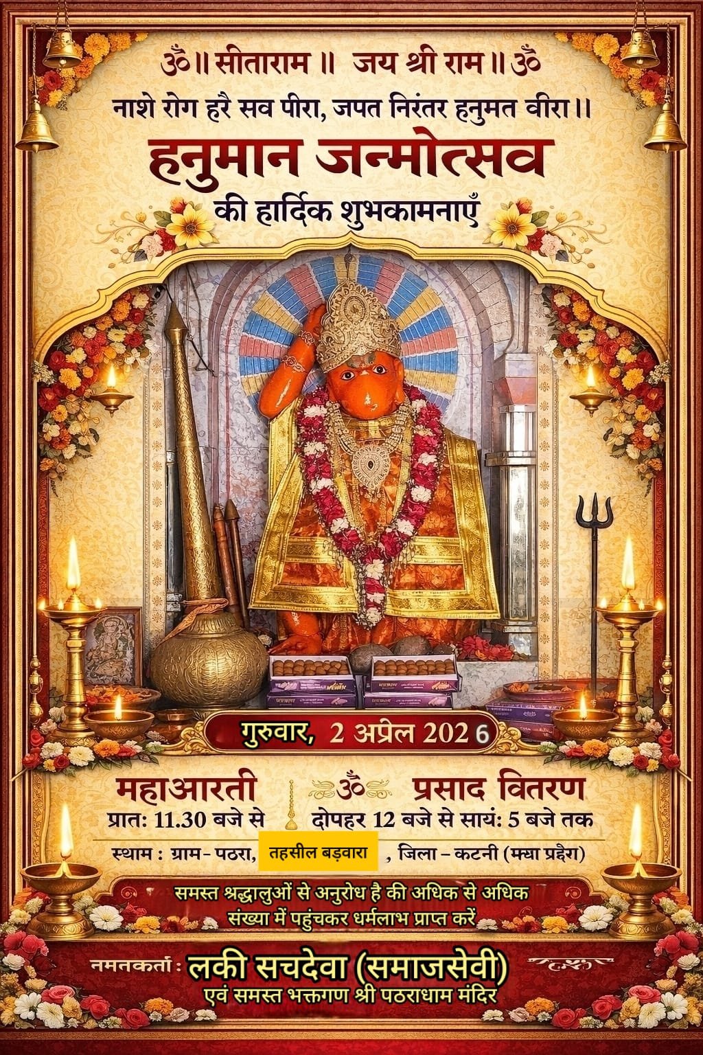 हनुमान मंदिर पठरा धाम में महाबली के जन्मोत्सव पर उमड़ेगी भक्तों की भीड़, सुबह से ही आयोजित होंगे विविध धार्मिक आयोजन
