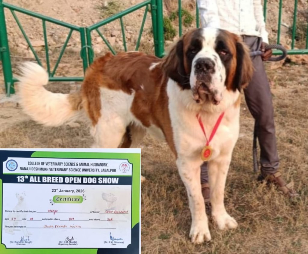 कटनी। जबलपुर के गवर्नमेंट हॉस्पिटल के पीछे सिविल लाइन ग्राउंड में 13वां ऑल ब्रीड ओपन डॉग शो का आयोजन किया गया। इस शो में प्रदेश भर से 134 कुत्तों ने भाग लिया और अपने प्रदर्शन से दर्शकों को आकर्षित किया। शो में उत्कृष्ट प्रदर्शन करने पर कॉलेज ऑफ वेटरिनरी साइंस एंड एनिमल हस्बैंड्री, नानाजी देशमुख वेटरिनरी साइंस यूनिवर्सिटी, जबलपुर द्वारा कटनी के सामाजिक कार्यकर्ता और डॉग लवर शुभ प्रकाश मिश्र के डॉगी मैंगो को सम्मानित किया गया। मैंगो की जिंस सेंट बर्नार्ड है और उसे प्रथम स्थान प्राप्त करने पर Best of Breed (BOB) का प्रमाणपत्र जारी किया गया है।