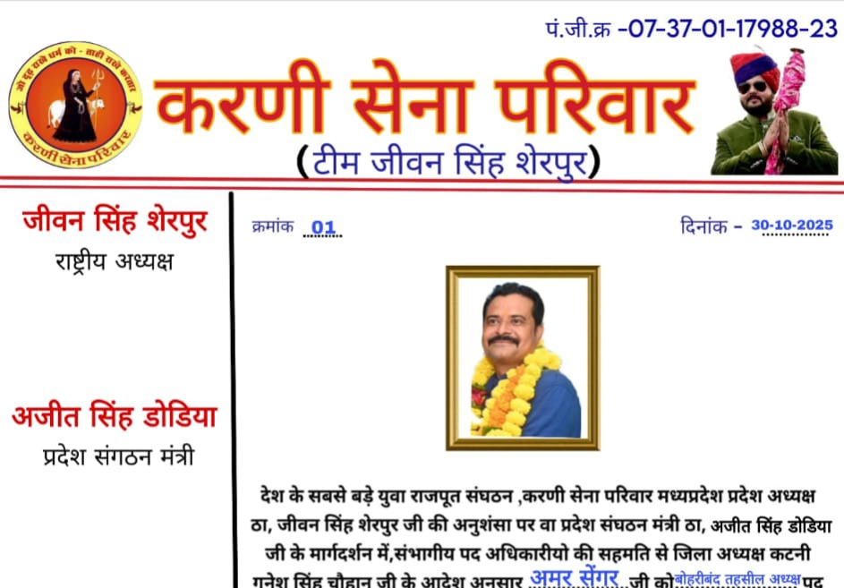 कटनी। देश के सबसे बड़े युवा राजपूत संघठन, करणी सेना परिवार मध्यप्रदेश प्रदेश अध्यक्ष ठा. जीवन सिंह शेरपुर की अनुशंसा पर व प्रदेश संघठन मंत्री ठा. अजीत सिंह डोडिया के मार्गदर्शन में, संभागीय पद अधिकारीयो की सहमति से जिला अध्यक्ष कटनी गनेश सिंह चौहान के आदेश अनुसार अमर सिंह सेंगर को बोहरीबंद तहसील अध्यक्ष पद पर मनोनीत किया गया है।