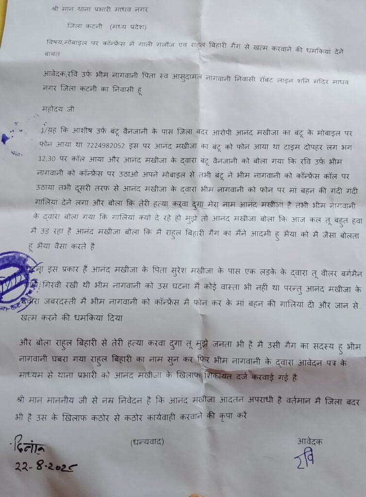 рдорд╛рдзрд╡рдирдЧрд░ рдерд╛рдирд╛ рдкреНрд░рднрд╛рд░реА рдХреЛ рд╢рд┐рдХрд╛рдпрддреА рдкрддреНрд░ рд╕реМрдВрдкрддреЗ рд╣реБрдП рд░реЙрдмрдЯ рд▓рд╛рдЗрди рд╢рдирд┐ рдордВрджрд┐рд░ рдорд╛рдзрд╡ рдирдЧрд░ рдирд┐рд╡рд╛рд╕реА рд░рд╡рд┐ рдЙрд░реНрдл рднреАрдо рдирд╛рдЧрд╡рд╛рдиреА рдкрд┐рддрд╛ рд╕реНрд╡. рдЖрд╕реБрджрд╛рдорд▓ рдирд╛рдЧрд╡рд╛рдиреА рдиреЗ рдХрд╣рд╛ рдХреА рдЖрд╢реАрд╖ рдЙрд░реНрдл рдмрдВрдЯреВ рд╡реИрдирдЬрд╛рдиреА рдХреЗ рдореЛрдмрд╛рдЗрд▓ рдкрд░ рдЧрдд рджрд┐рд╡рд╕ рдЬрд┐рд▓рд╛ рдмрджрд░ рдЖрд░реЛрдкреА рдЖрдирдВрдж рдордЦреАрдЬрд╛ рдХрд╛ рдлреЛрди рдЖрдпрд╛ рдФрд░ рдЖрдирдВрдж рдордЦреАрдЬрд╛ рдиреЗ рдмрдВрдЯреВ рд╡реИрдирдЬрд╛рдиреА рд╕реЗ рдХрд╣рд╛ рдХреА рд░рд╡рд┐ рдЙрд░реНрдл рднреАрдо рдирд╛рдЧрд╡рд╛рдиреА рдХреЛ рдХреЙрдиреНрдлреНрд░реЗрдВрд╕ рдкрд░ рдЕрдкрдиреЗ рдореЛрдмрд╛рдЗрд▓ рд╕реЗ рдХрдиреЗрдХреНрдЯ рдХрд░реЛред рддрднреА рдмрдВрдЯреВ рдиреЗ рднреАрдо рдирд╛рдЧрд╡рд╛рдиреА рдХреЛ рдХреЙрдиреНрдлреНрд░реЗрдВрд╕ рдХреЙрд▓ рдкрд░ рдХрдиреЗрдХреНрдЯ рдХрд┐рдпрд╛ред рджреВрд╕рд░реА рддрд░рдл рд╕реЗ рдЖрдирдВрдж рдордЦреАрдЬрд╛ рдХреЗ рдиреЗ рднреАрдо рдирд╛рдЧрд╡рд╛рдиреА рдХреЛ рдлреЛрди рдкрд░ рдорд╛рдВ рдмрд╣рди рдХреА рдЧрдВрджреА рдЧрдВрджреА рдЧрд╛рд▓рд┐рдпрд╛рдВ рджреЗрддреЗ рд╣реБрдП рдХрд╣рд╛ рдХреА рддреЗрд░реА рд╣рддреНрдпрд╛ рдХрд░рд╡рд╛ рджреВрдВрдЧрд╛, рдореЗрд░рд╛ рдирд╛рдо рдЖрдирдВрдж рдордЦреАрдЬрд╛ рд╣реИред рдЖрдирдВрдж рдордЦреАрдЬрд╛ рдиреЗ рдЙрд╕реЗ рдзрдордХрд╛рддреЗ рд╣реБрдП рдХрд╣рд╛ рдХрд┐ рдореИрдВ рд░рд╛рд╣реБрд▓ рдмрд┐рд╣рд╛рд░реА рдЧреИрдВрдЧ рдХрд╛ рдореЗрди рдЖрджрдореА рд╣реВрдВред рднреИрдпрд╛ рдХреЛ рдореИрдВ рдЬреИрд╕рд╛ рдмреЛрд▓рддрд╛ рд╣реВрдВ рднреИрдпрд╛ рд╡реИрд╕рд╛ рдХрд░рддреЗ рд╣реИред рднреАрдо рдиреЗ рдШрдЯрдирд╛ рдХрд╛ рдЬрд┐рдХреНрд░ рдХрд░рддреЗ рд╣реБрдП рдХрд╣рд╛ рдХреА рдЖрдирдВрдж рдордЦреАрдЬрд╛ рдХреЗ рдкрд┐рддрд╛ рд╕реБрд░реЗрд╢ рдордЦреАрдЬрд╛ рдХреЗ рдкрд╛рд╕ рдПрдХ рд▓рдбрд╝рдХреЗ рдХреЗ рджреНрд╡рд╛рд░рд╛ рдЯреВ рд╡реАрд▓рд░ рдЧрд┐рд░рд╡реА рд░рдЦреА рдЧрдИ рдереАред рдореЗрд░рд╛ рдЙрд╕ рдШрдЯрдирд╛ рд╕реЗ рдХреЛрдИ рд╡рд╛рд╕реНрддрд╛ рднреА рдирд╣реАрдВ рдерд╛, рдкрд░рдиреНрддреБ рдЖрдирдВрдж рдордЦреАрдЬрд╛ рдХреЗ рдмреЗрд╡рдЬрд╣ рднреАрдо рдирд╛рдЧрд╡рд╛рдиреА рдХреЛ рдХреЙрдиреНрдлреНрд░реЗрдВрд╕ рдореЗрдВ рдлреЛрди рдХрд░ рдХреЗ рдЬрд╛рди рд╕реЗ рдЦрддреНрдо рдХрд░рдиреЗ рдХреА рдзрдордХрд┐рдпрд╛рдВ рджреАред рд╢рд┐рдХрд╛рдпрддреА рдкрддреНрд░ рдХреЗ рдорд╛рдзреНрдпрдо рд╕реЗ рд╢рд┐рдХрд╛рдпрдд рдХрд░реНрддрд╛ рдиреЗ рдХрд╣рд╛ рдХреА рдЖрдирдВрдж рдордЦреАрдЬрд╛ рдЖрджрддрди рдЕрдкрд░рд╛рдзреА рд╣реИ рд╡рд░реНрддрдорд╛рди рдореЗрдВ рдЬрд┐рд▓рд╛ рдмрджрд░ рднреА рд╣реИред рдЙрдХреНрдд рдмрджрдорд╛рд╢ рдХреЗ рдЦрд┐рд▓рд╛рдл рдХрдареЛрд░ рдХрд╛рд░реНрд░рд╡рд╛рдИ рдХреА рдЬрд╛рдПред