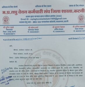 मध्य प्रदेश लघु वेतन कर्मचारी संघ मुख्यमंत्री के नाम कल सौंपेगा ज्ञापन कटनी। मध्य प्रदेश लघु वेतन कर्मचारी संघ जिला कटनी जिलाध्यक्ष पूर्णेश उइके एवं