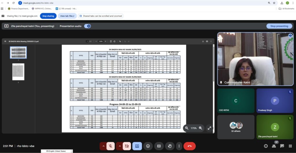 कटनी। जिला पंचायत के अतिरिक्त मुख्य कार्यपालन अधिकारी एवं परियोजना अधिकारी (मनरेगा) समस्त जनपद पंचायतों से समन्वय स्थापित कर एवं सतत रूप से निगरानी करते हुए लक्ष्य के विरुद्ध प्रगति लाना सुनिश्चित करें। इस आशय के निर्देश गुरुवार को जिला पंचायत की सीईओ सुश्री तपस्या परिहार ने “एक बगिया मां के नाम अभियान” की प्रगति की समीक्षा वीडियो कॉन्फ्रेंसिंग से करते हुए अधिकारियों को दिए। इस दौरान उन्होंने एक बगिया मां के नाम की प्रगति की जनपद पंचायत वार जानकारी ली और दो दिवस में पात्र हितग्राहियों का चयन करने खंड स्तरीय अधिकारियों को निर्देश दिए। जिला पंचायत की सीईओ ने समीक्षा करते हुए ग्रामीण यांत्रिकी सेवा के कार्यपालन यंत्री को प्रगति लाने में लापरवाही बरतने वाले उपयांत्रियों के विरुद्ध सख्त कार्रवाई करने हेतु निर्देशित किया। “एक बगिया मां के नाम अभियान” की विस्तार से समीक्षा करते हुए जिला पंचायत सीईओ सुश्री तपस्या परिहार ने निर्धारित लक्ष्य के विरुद्ध जिले की प्रगति अत्यंत कम पाए जाने पर नाराजगी जताते हुए समस्त जनपद पंचायतों के आजीविका मिशन के ब्लॉक प्रबंधकों को शोकाज नोटिस जारी करने के निर्देश आजीविका मिशन की जिला परियोजना प्रबंधक को दिए।