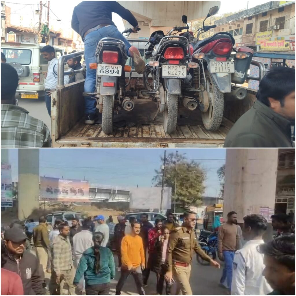कटनी। शहर की यातायात व्यवस्था को सुगम बनाने और नियमों के उल्लंघन पर अंकुश लगाने के उद्देश्य से नगर निगम एवं पुलिस प्रशासन द्वारा संयुक्त रूप से पहल की जा रही है। इसी श्रृंखला में गुरुवार को सुगम यातायात व्यवस्था मुहैया कराने को लेकर बरगवां क्षेत्र में अव्यवस्थित रूप से खड़े वाहनों को जब्त करने की कार्यवाही की गई। इस संबंध में अतिक्रमण प्रभारी ने जानकारी देते हुए बताया कि डाॅ विकास गुप्ता से मिशन चैक तक कार्यवाही के दौरान सार्वजनिक मार्ग पर अव्यवस्थित रूप से मोटर साईकिल वाहन एवं ट्रेक्टर वाहन खड़ा कर आवागमन अवरूद्ध करते पाए जाने पर तीन मोटर सायकिल एवं दो टेक्ट्रर वाहन जब्त करनें की कार्यवाही की जाकर एक हजार रूपये का जुर्माना किया गया। की गई। कार्यवाही के दौरान पुलिस बल, यातायात विभाग एवं नगर निगम का अमला मौजूद रहा।
