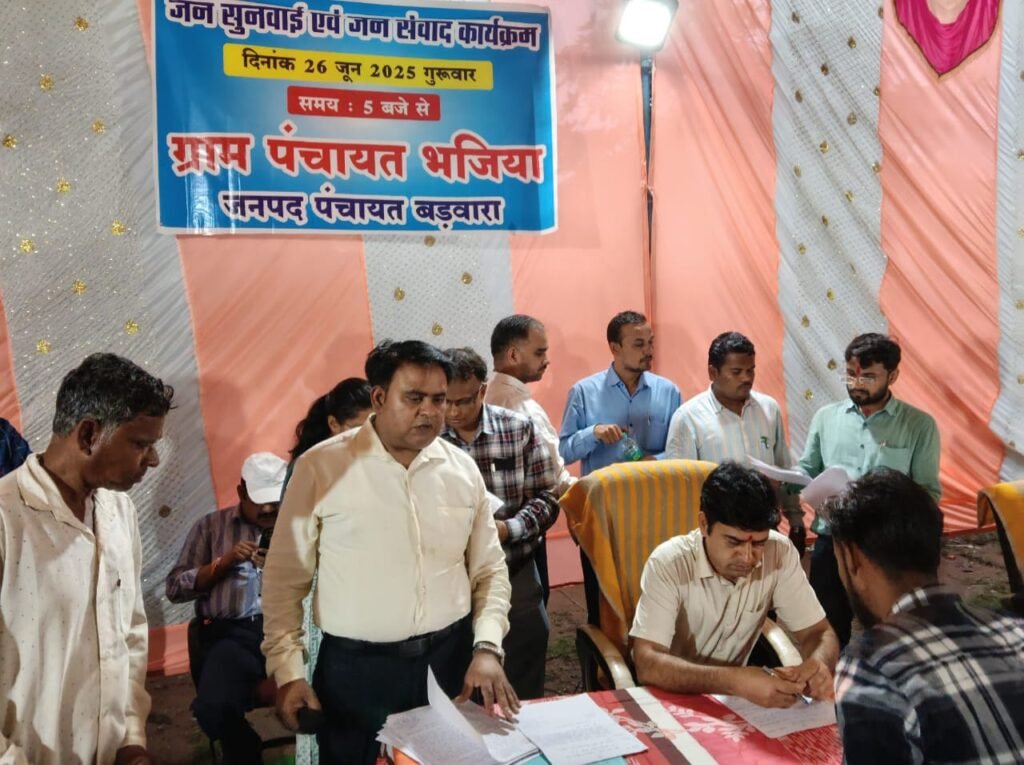 भजिया में आयोजित लोक सुनवाई सह जनसंवाद कार्यक्रम में कलेक्टर सुन रहे ग्रामीणों की समस्यायें