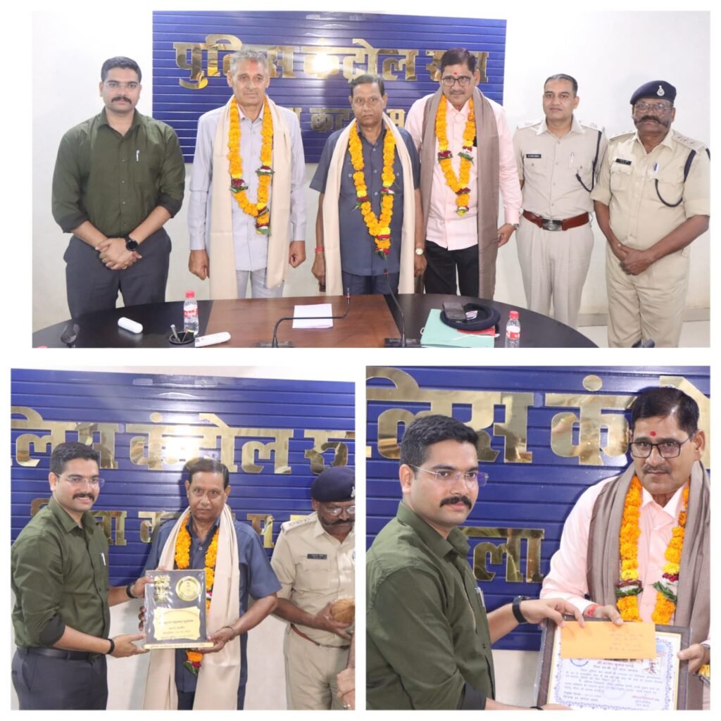 कटनी। पुलिस बल में लंबे समय तक सेवा देने वाले सहायक उपनिरीक्षक कृष्ण कुमार शुक्ला, संजय कुमार पांडे एवं उमा नारायण गर्ग के सेवा-निवृत्ति अवसर पर आज पुलिस अधीक्षक कार्यालय कटनी में स्नेहपूर्ण विदाई समारोह का आयोजन किया गया। समारोह में मुख्य अतिथि पुलिस अधीक्षक अभिनय विश्वकर्मा ने तीनों सहायक उप निरीक्षकों को शॉल, श्रीफल, प्रशस्ति-पत्र एवं पुलिस मोमेंटो भेंट कर ससम्मान विदाई दी। इस दौरान एसपी श्री विश्वकर्मा ने उनके अनुकरणीय सेवाभाव और निष्ठा की सराहना करते हुए कहा की जिला पुलिस बल के लिए आपका योगदान अविस्मरणीय रहेगा। हम आपको स्वस्थ, सुखद एवं सम्मानपूर्ण जीवन की शुभकामनाएँ देते हैं।