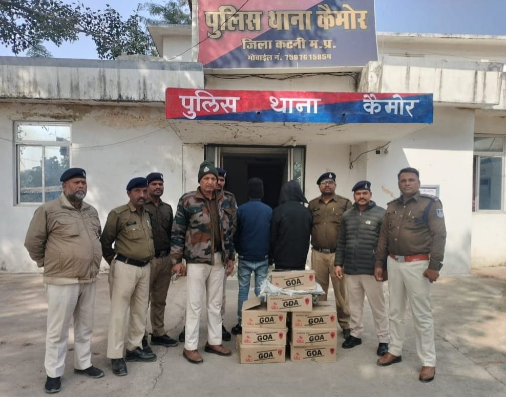 कार्यवाही के संबंध में जानकारी देते हुए कैमोर थाना प्रभारी आशीष शर्मा ने बताया कि कैमोर थाने मे गत 05 जनवरी को मुखबिर ने सूचना दी की एक काले रंग का ऑटो क्रमांक MP54R1069 झुकेही से कैमोर तरफ जायेगा उसमें भारी मात्रा में शराब लोड है। मुखबिर से सूचना मिलते ही केमोर थाना प्रभारी आशीष शर्मा स्टाफ के साथ रवाना हुए। जैसे ही ग्राम बडारी मैन रोड के पास पहुंचे तो सामने से आटो आते दिखाई दिया। जिसे स्टाफ की मदद से रोका गया। आटो चालक अमन कुमार चौधरी पिता मनोज कुमार चौधरी उम्र 22 वर्ष निवासी ग्राम टिकरवारा थाना कुठला के कब्जे से आटो क्र. MP54R1069 एवं आटो मे 7 पेटी अंग्रेजी गोवा शराब मात्रा 63 लीटर कीमती 49000रु. की बरामद की गई। आरोपी के खिलाफ धारा 34(2) आबकारी एक्ट का अपराध पंजीबद्ध कर विवेचना की जा रही है। पूछताछ में आरोपी अमन चौधरी ने बताया कि उक्त शराब उसने मेहगांव निवासी शिवम गुरुंग पिता स्व. छोटेलाल गुरुंग उम्र 35 साल निवासी मेहगांव थाना कैमोर कटनी के कहने पर शराब लेकर आया था। आरोपी शिवम गुरुंग के कब्जे से 1 मोबाईल एक पेटी शराब कीमती करीबन 5000रु. जब्त की गई। कुल मिलाकर 8 पेटी 72 लीटर शराब कीमती करीबन 54 हजार रु. की जप्त की गई। एक अन्य आरोपी अतुल राय की तलाश की जा रही है। आरोपियो अमन चौधरी, शिवम गुरुंग को गिरफ्तार कर माननीय न्यायालय पेश किया गया है। कार्रवाई में थाना प्रभारी आशीष कुमार शर्मा, उपनिरीक्षक दिनेश करोसिया, उपनि विनोद दाहिया, आर. अजीत तिवारी, आर. लालू यादव, आर. विकासपुरी गोस्वामी, प्र.आर चंद्रभान विश्वकर्मा, आर विनोद कुमार, आर सौरभ कुमार, आर मुकेश मिश्रा ने महत्वपूर्ण भूमिका निभाई।