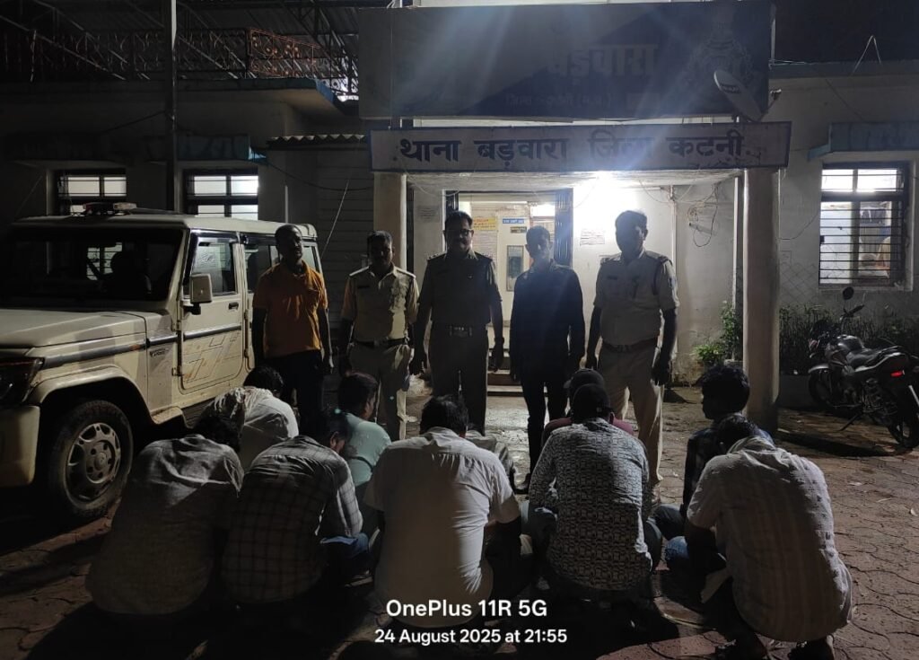 рдЬрд╣рд╛рдВ рдПрдХ рддрд░рдл рдХрдЯрдиреА рдХреЗ рдЬреБрдЖрд░реА рдЕрдкрдиреА рдЯреЛрд▓реА рдмрдирд╛рдХрд░ рд╣рд╛рд░ рдЬреАрдд рдХрд╛ рдЦреЗрд▓ рдЦреЗрд▓ рд░рд╣реЗ рдереЗ, рд╡рд╣реАрдВ рджреВрд╕рд░реА рддрд░рдл рдПрдХ рдФрд░ рдЯреЛрд▓реА рдереА рдЬреЛ рдХреА рдЬрдмрд▓рдкреБрд░ рдХреЗ рдЬреБрдЖрд░рд┐рдпреЛрдВ рдХреА рдереАред рдкреБрд▓рд┐рд╕ рдиреЗ рдХрд╛рд░реНрдпрд╡рд╛рд╣реА рдХрд░рддреЗ рд╣реБрдП рдЬрдпрдкреНрд░рдХрд╛рд╢ рд╡рд╛рд░реНрдб рдкрдирд╛рдЧрд░ рдирд┐рд╡рд╛рд╕реА 48 рд╡рд░реНрд╖реАрдп рд░рд╛рдХреЗрд╢ рдкрдЯреЗрд▓ рдкрд┐рддрд╛ рд▓рд╛рд▓рд╛рд░рд╛рдо рдкрдЯреЗрд▓, рд░рдлреА рдЕрд╣рдордж рдХрд┐рджрд╡рдИ рд╡рд╛рд░реНрдб рдХрдЯрдиреА рдирд┐рд╡рд╛рд╕реА рд▓рд╛рд▓рд╛ рдЙрд░реНрдл рд░рд╛рдЬрдХреБрдорд╛рд░ рд╡рд┐рд╢реНрд╡рдХрд░реНрдорд╛, рдорд╣рд╛рд░рд╛рдЬрдкреБрд░ рдЬрдмрд▓рдкреБрд░ рдирд┐рд╡рд╛рд╕реА 34 рд╡рд░реНрд╖реАрдп рд╣рд░реАрд╢ рдЖрд░реНрдпрд╛ рдкрд┐рддрд╛ рдПрдЖрд░ рдЖрд░реНрдпрд╛, рдкрдирд╛рдЧрд░ рдЬрдмрд▓рдкреБрд░ рдирд┐рд╡рд╛рд╕реА 44 рд╡рд░реНрд╖реАрдп рд╡рд┐рдиреЛрдж рдкрд┐рддрд╛ рд░рд╛рдЬрд╛рд░рд╛рдо рд╡рд┐рд╢реНрд╡рдХрд░реНрдорд╛ рдПрд╡рдВ рдкрдирд╛рдЧрд░ рдЬрдмрд▓рдкреБрд░ рдирд┐рд╡рд╛рд╕реА 51 рд╡рд░реНрд╖реАрдп рд╡рд┐рдЬрдп рдард╛рдХреБрд░ рдкреНрд░рддрд╛рдк рднрдЧрд╡рдд рд╕рд┐рдВрд╣ рдард╛рдХреБрд░ рдХреЛ рд░рдВрдЧреЗ рд╣рд╛рдереЛрдВ рдЧрд┐рд░рдлреНрддрд╛рд░ рдХрд┐рдпрд╛ рдПрд╡рдВ рдЙрдирдХреЗ рдкрд╛рд╕ рд╕реЗ 16900 рд░реБрдкрдП рдирдЧрдж рдФрд░ рддрд╛рд╢ рдХреЗ рдкрддреНрддреЗ рдЬрдкреНрдд рдХрд┐рдПред