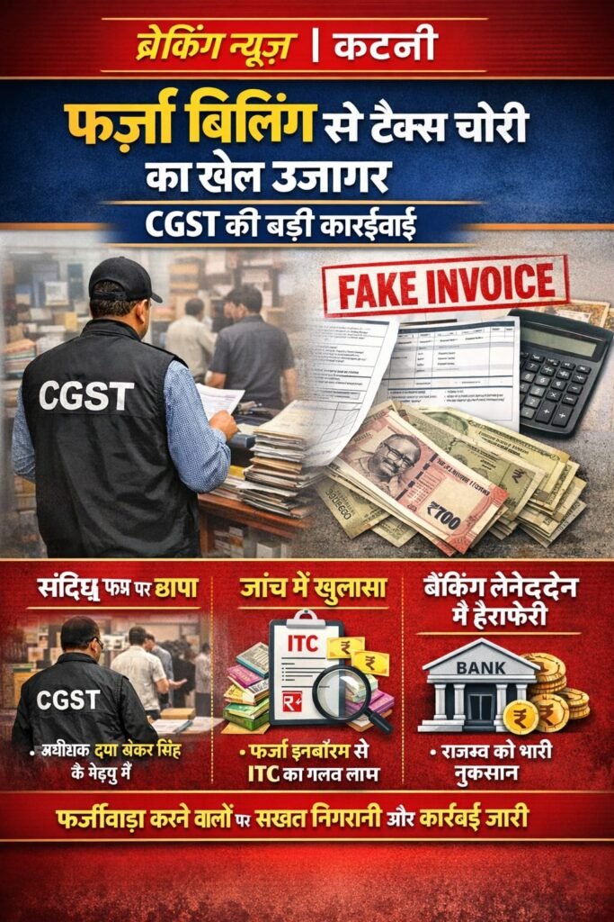 कटनी। कटनी में फर्जी इनवॉइस के जरिए जीएसटी में कर अपवंचन (टैक्स चोरी) का बड़ा मामला सामने आया है। केंद्रीय वस्तु एवं सेवा कर (CGST) विभाग की निवारक शाखा ने पुलिस अधीक्षक कार्यालय से प्राप्त सूचना के आधार पर कार्रवाई करते हुए संदिग्ध फर्म पर छापामार जांच की।